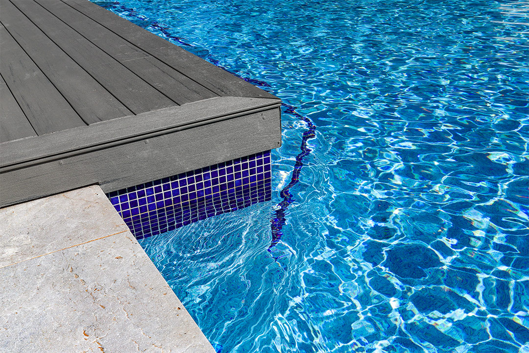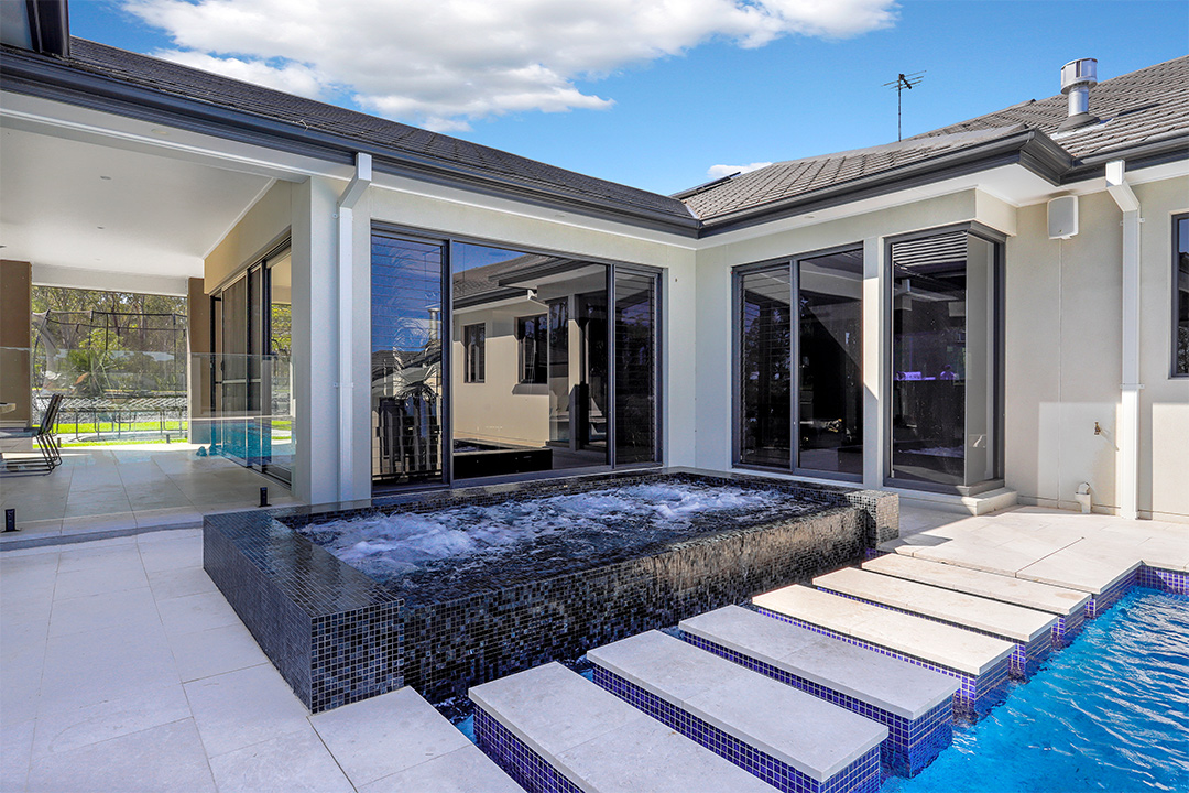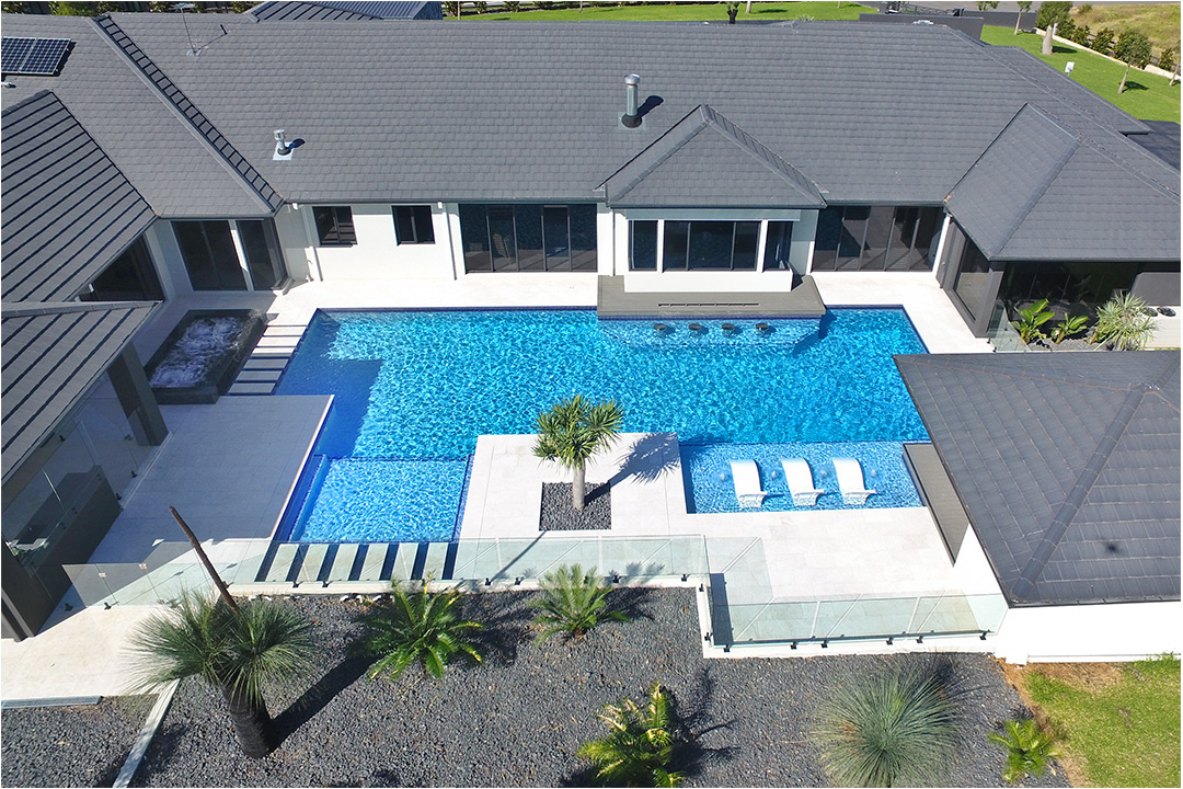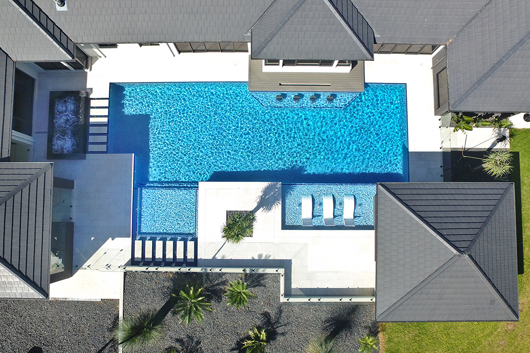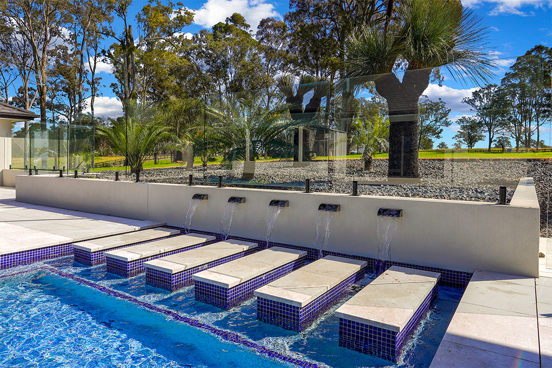 Working to the client’s brief of constructing a sizeable family pool that would also serve as the major feature of the home, this expansive 18m x 6m pool is large enough to comfortably swim laps in, and its abundance of features and shallow ledges allow it to double in function by transforming this pool into a aquatic playground for the homeowners’ three young boys.