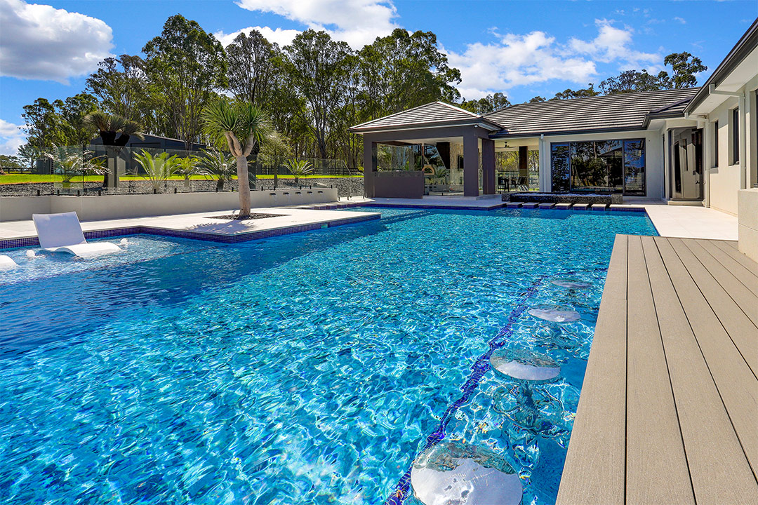 This breathtaking pool and outdoor design was specifically designed by Gavin Bazley of Aquastone Pools & Landscapes in close conjunction with the homeowners to be the centrepiece of this sprawling property. Set in rich, luscious surrounds and embraced by the home’s external perimeter, this stunning pool is visible from all of the home’s internal and external living areas.