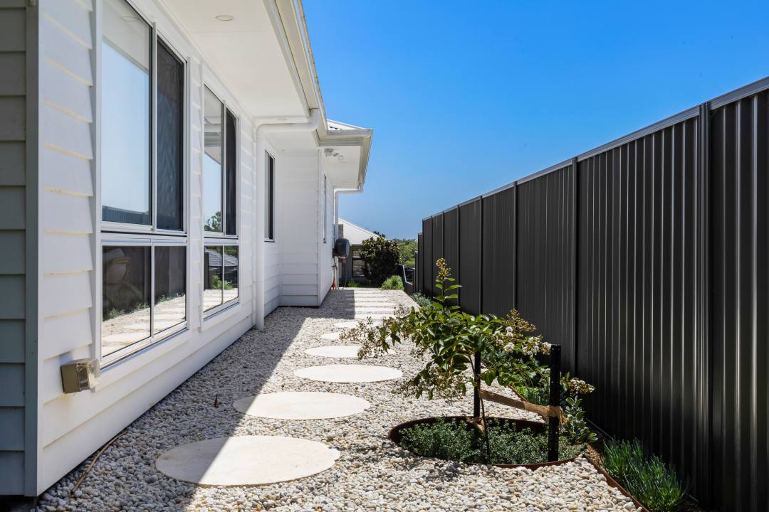 Customised, extensive drainage solutions were integrated into the build to ensure long-lasting, erosion-free results across varying levels. With the revamped space spanning across the front, back and side of the home, natural materials such as steel edging, limestone Savona pavers and steppers were used to maintain cohesion throughout.
