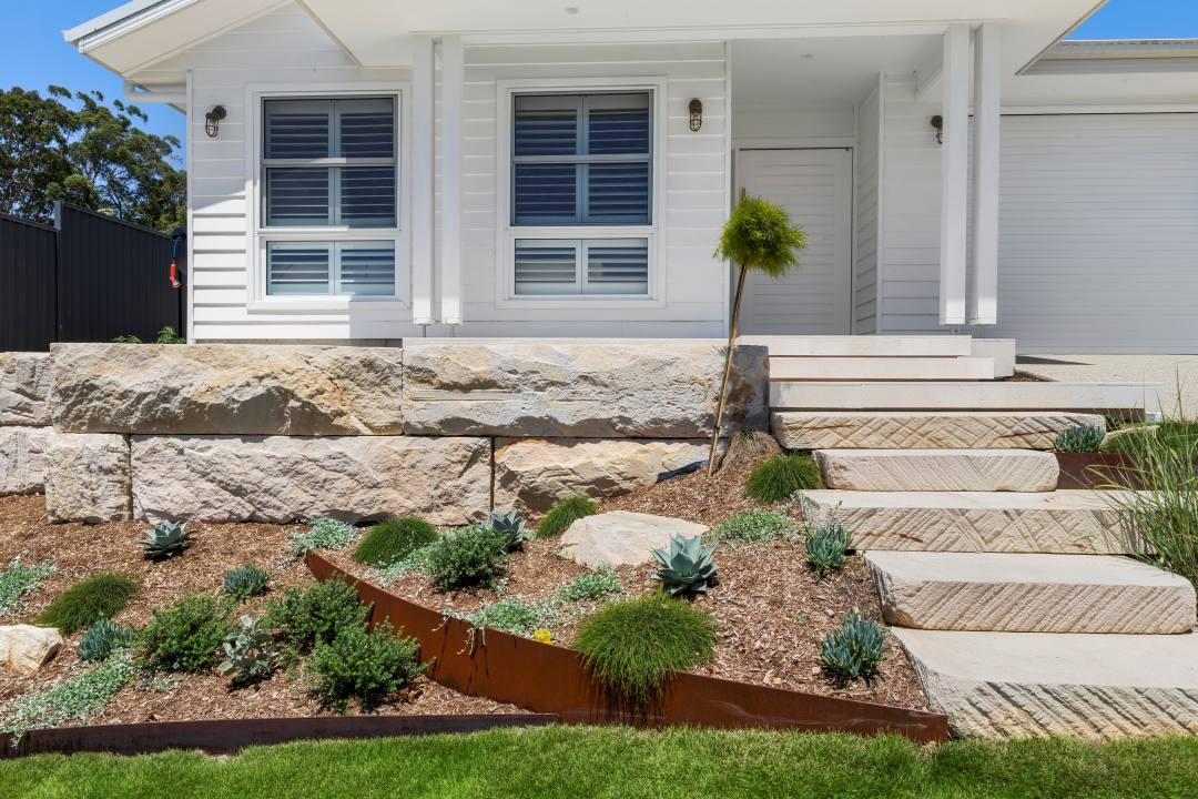 The textured sandstones curved edges were hand-crafted onsite, enhancing the natural beauty it surrounds. Using light, muted tones and earthy hues, the client’s vision for a coastal, nature-inspired landscape was brought to life. Engineered retaining walls provided a clean, sleek finish and ensured function and safety throughout the space.