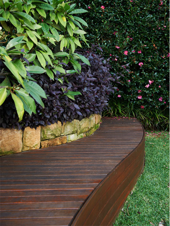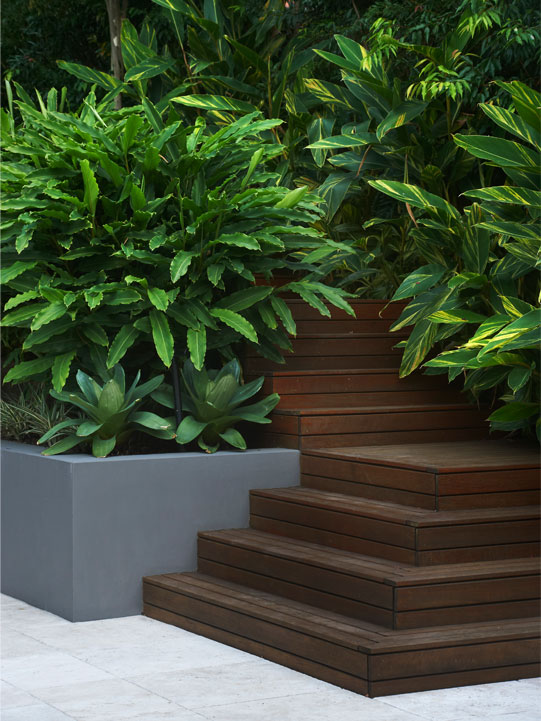 Rainforest-inspired Elaeocarpus eumundii, Waterhousia floribunda, Syzygium ‘Cascade’ and Elaeagnus macropyhlla were selected for screening, while Philodendron ‘Xanadu’, Ctenanthe setosa, Elettaria cardamoum and Alpinia zerumbet create shaded areas. Hymenocallis caribaea, Alternanthera dentate, Beschomeria yuccoides and Senicio serpens add texture and contrast in the sunny spots.