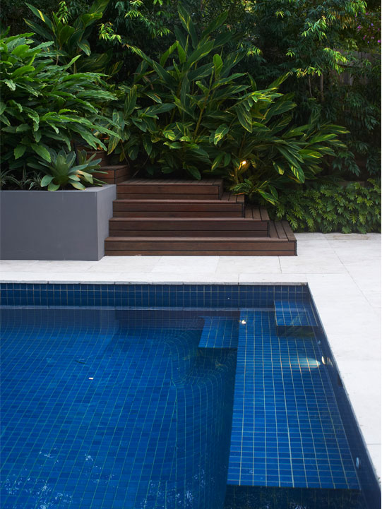 The deep blue interior is set against classic 600mm x 600mm travertine coping and paving in ‘Nutmeg’. The seated area features sandstone, complemented by the warmth of spotted gum timber, which has been used throughout the space. Weatherproof cushions are a practical addition to the seated area.