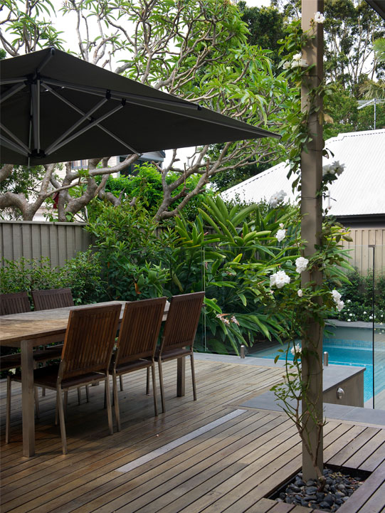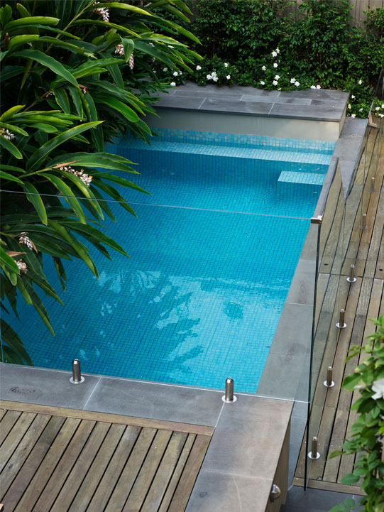 The success of the space is in part due to the considered combination of materials and finishes. The vibrant mosaic pool tiles are complemented by bluestone coping. Bluestone has been used throughout the space, paired with spotted gum timber decking. Spotted gum was selected to complement the house and to provide a natural and tactile material to the design.