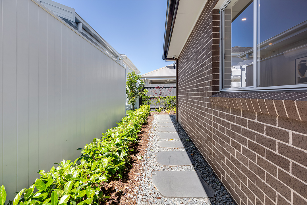 The wonderfully skilled team at Insight Landscapes adorned these display homes by Masterton Homes with an array of landscaped elements, including a beautiful alfresco courtyard, immaculately landscaped backyard, calming water features and styled passageways.