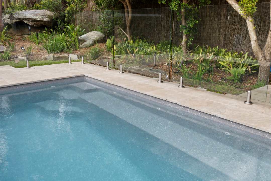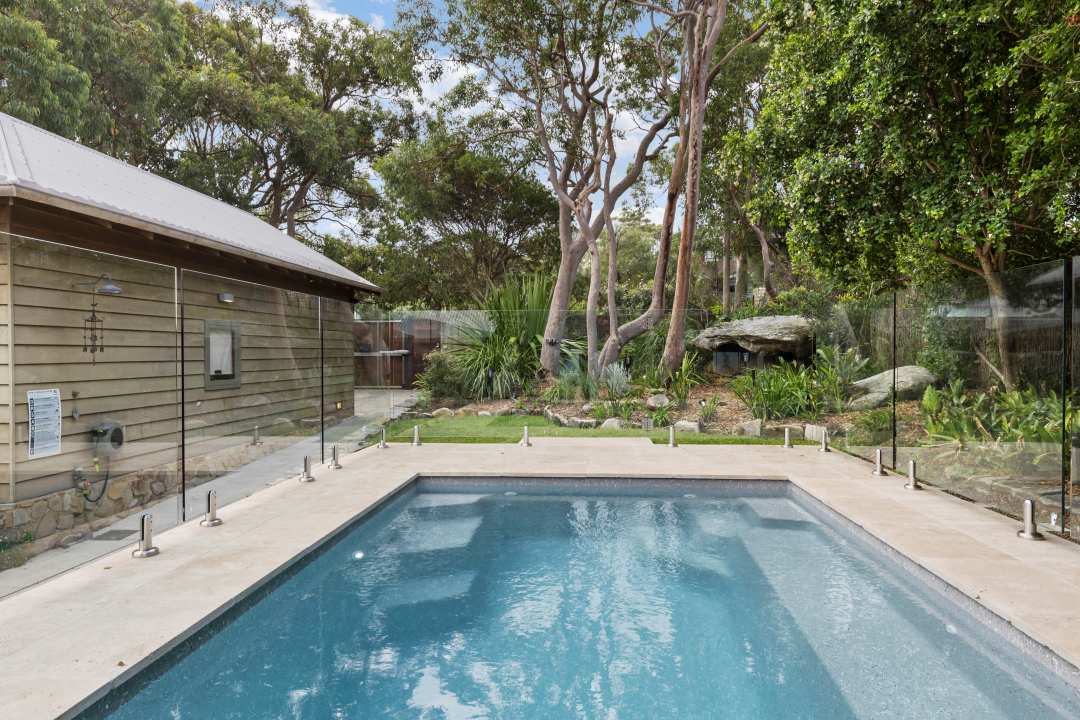 A frameless glass balustrade traces the pool’s perimeter, creating an uninterrupted visual connection to the surrounding trees. The effect is striking, as water appears to float within landscape, blurring the boundary between architecture and nature. From every angle, the pool offers long, calm sightlines into greenery, reinforcing a feeling of retreat and privacy.