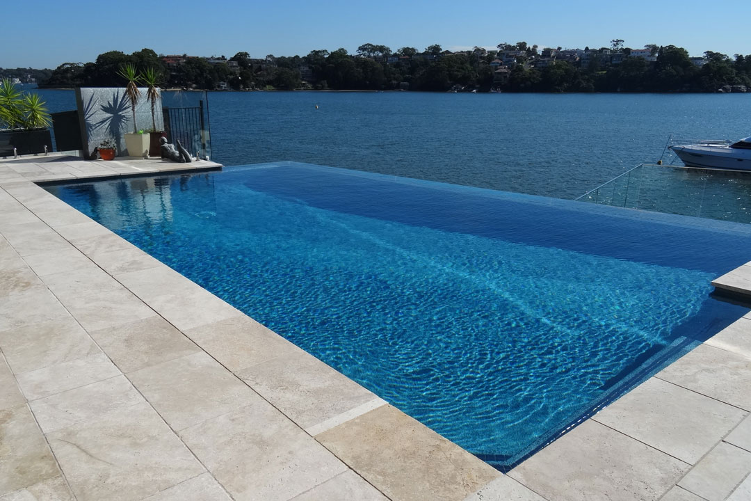 Situated on a sloping block, accessibility was an issue. The existing pool was demolished by hand and an underground sullage tank was found and couldn’t be removed. Working around this, Pacific Pools adapted the planned design and cleaned, rendered and waterproofed the tank and used it to house the water from the pool’s new infinity-edge.