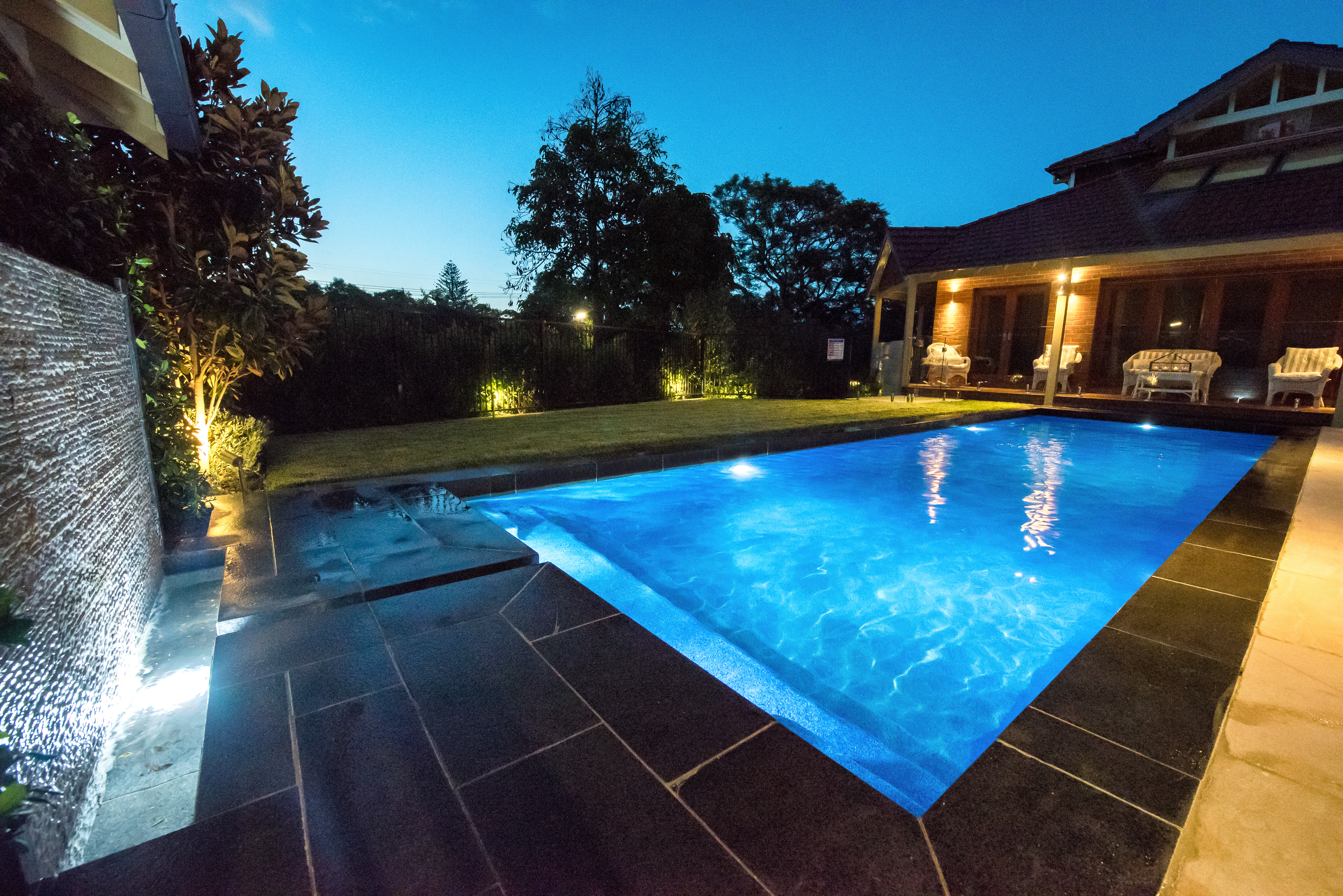 The contrasting stone, brilliant lighting and stunning interior colour, creates a welcoming entertainment area for family and friends. This new space is perfect for the homeowners, who wanted a pool area that would blend seamlessly with the existing style of the house. The young family also wanted a multi-functional area that included a water feature, barbecue, seating areas and a lawn area.